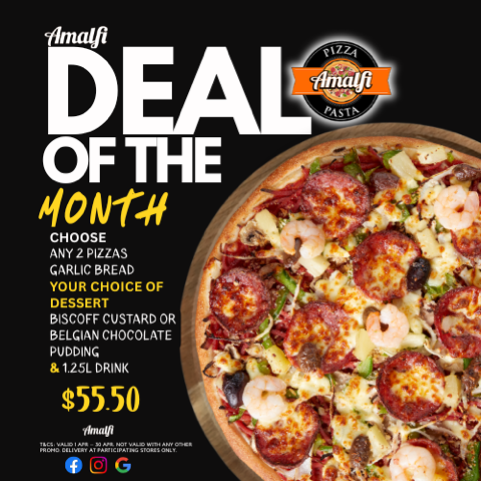 April Deal – Pizza and Pudding Combo$55.502× Large Pizzas (any choice), 1× Pudding (Oreo or Biscoff), 1× Garlic Bread, 1× 1.25L Drink