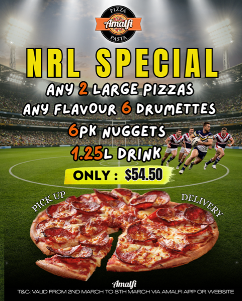 NRL DEAL$54.50Any 2 Large Pizzas (from the menu) + 6pk Chicken Drumettes + 6pk Chicken Nuggets + 1.25L Bottle of Drink