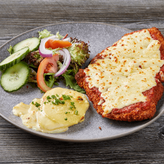 Bolognese Chicken Parmigiana$25.50Chicken Breast, Homemade Bolognese Sauce, Parmesan Cheese, Mozzarella Cheese, Scalloped Potato And Salad×