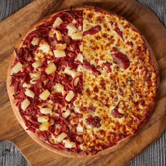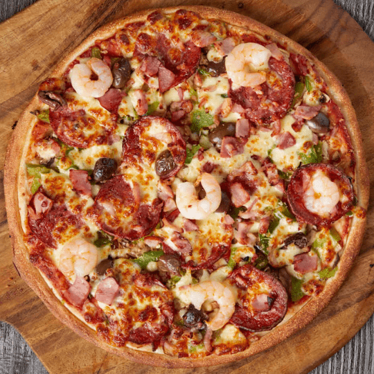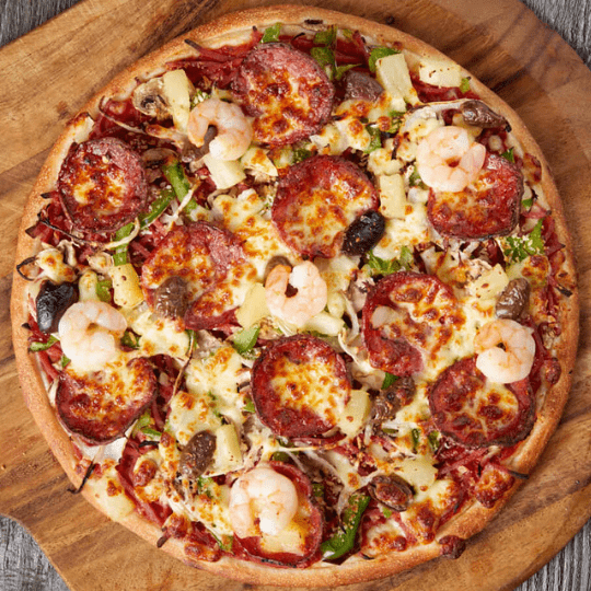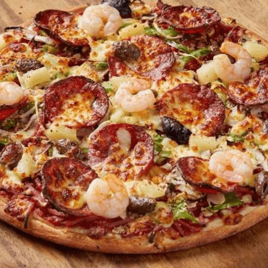Ham, Hot Salami, Mushroom, Onion, Capsicum, Pineapple, Olives And Prawns