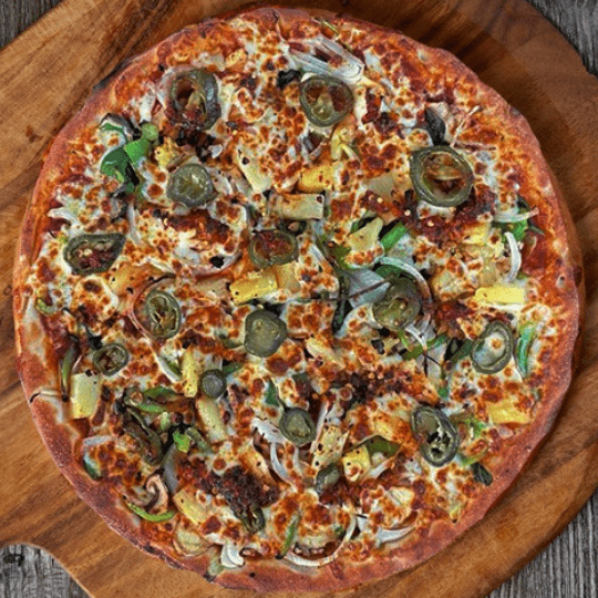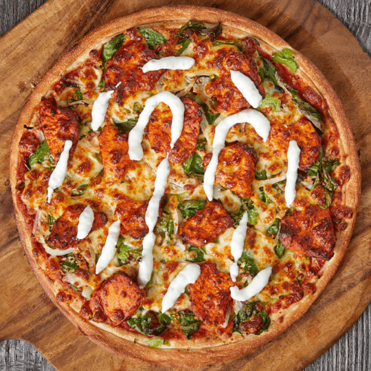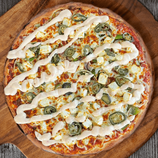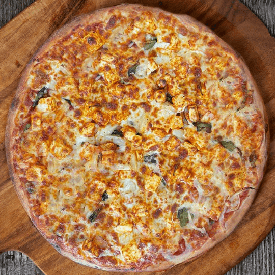 Tomato Sauce, Mozzarella, Spinach, Onions, Pineapple, Tandoori Paneer
